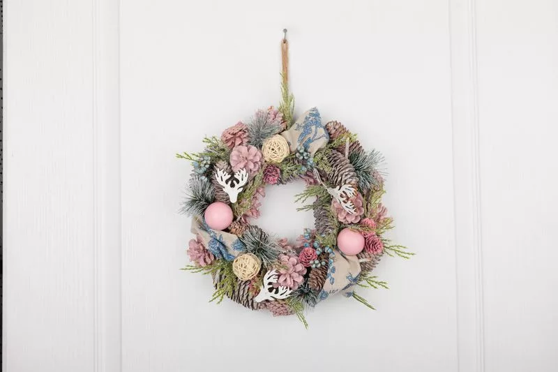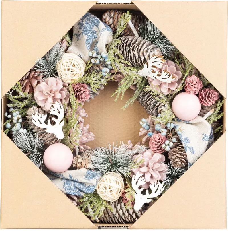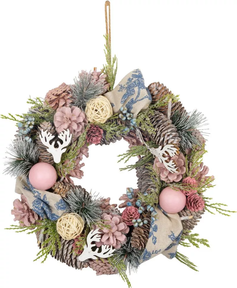 A MagicHome karácsonyi koszorú kialakítása eleganciát és ünnepi hangulatot varázsol otthonába. A koszorút természetes fenyőtobozok, dekoratív virágok és dekoratív gömbök díszítik rózsaszín-narancs árnyalatokban, modern, mégis meleg megjelenést kölcsönözve.