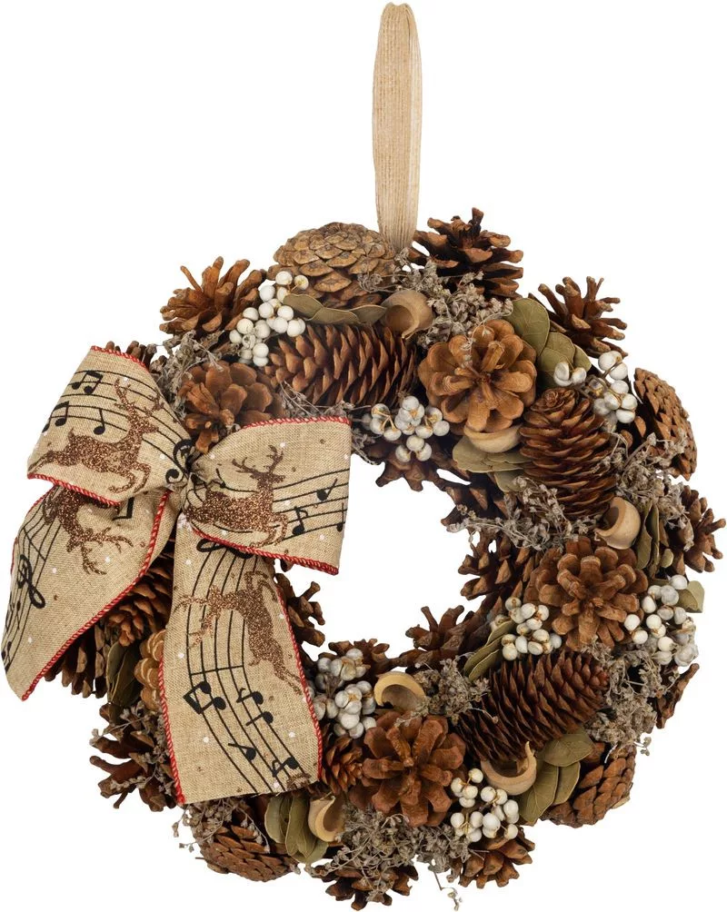 A dekorációt egy zenei motívummal ellátott díszes masni egészíti ki, amely eredeti és hagyományos megjelenést kölcsönöz a koszorúnak. A koszorú praktikus hurokkal rendelkezik a felakasztáshoz, így könnyedén elhelyezheti ajtóra, falra vagy ablakra.