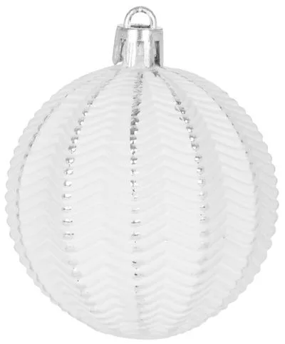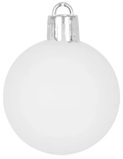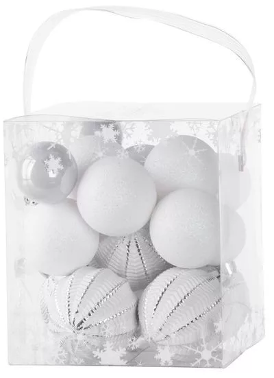 A karácsonyfa díszkészlet a karácsonyfa ünnepi díszítésére szolgál. 31 db 3-6 cm átmérőjű karácsonyi gömbből áll. A gömbök színe fehér-ezüst. Műanyagból készült.