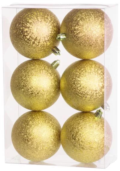A karácsonyfa díszkészlet a karácsonyfa ünnepi díszítésére szolgál. 6 db 8 cm átmérőjű karácsonyi gömb. A gömbök színe arany. Műanyagból készült.