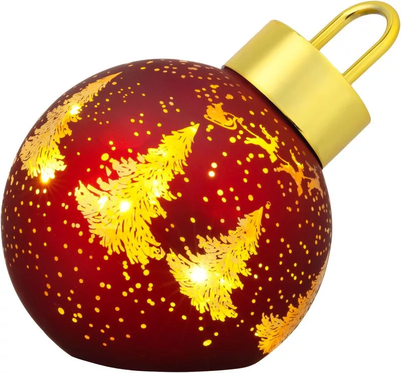 Adjon elegáns ünnepi hangulatot otthonának a MagicHome piros karácsonyi gömbbel. Ez a dekoráció üvegből készült, és aranyszínű fák finom mintájával díszített, amelyek gyönyörűen világítanak a 10 melegfehér fényű LED-nek köszönhetően.