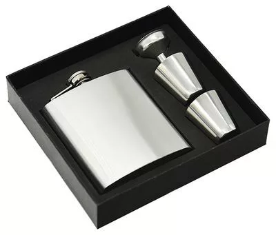 A készlet egy tölcsért is tartalmaz, hogy az italt kényelmesebben át lehessen tölteni a laposüvegből.