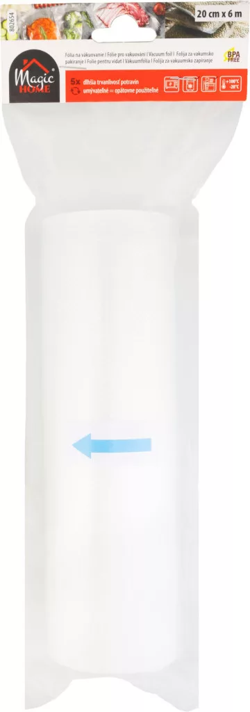 A MagicHome vákuumfóliával hosszabb ideig frissebbek és ízletesebbek maradnak az élelmiszerek. Ez az extra hosszú tekercs ideális nagyobb mennyiségű élelmiszer hatékony és gazdaságos csomagolásához.