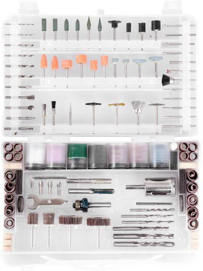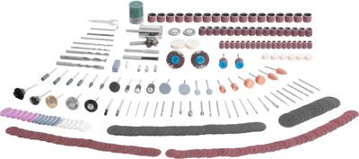 1x gyémánt maró, 1x csempefúró, 1x gyémánt maró, 1x gipszkarton fúró, 5x fafúró, 1x horonyvágó, 1x sarokvágó, 4x favágó, 3x csiszolóhenger meghajtó, 52x csiszolókorongos henger, 1x biztosítótű filcpolírozó testekhez, 1x filckúp kerek tetejű, 8x filchenger, 10x gyémántfúró, 6x univerzális fúró, 2x gyémánt vágótárcsa 22 mm, 6x polírozó hegy, 10x csiszolótest, 4x drótkefe, 3x forgó radiálkefe, 1x csiszolókő szilíciumkarbidból, 2x tüske csiszolókorongokhoz, 1x tüske csiszolópapírhoz, 80x csiszolópapír, 52x vágótárcsa, 4x lamellás csiszolótárcsa, 20x csiszolókorong, 3x tokmány, 1x polírozó paszta, 1x csavarkulcs, 1x tok.