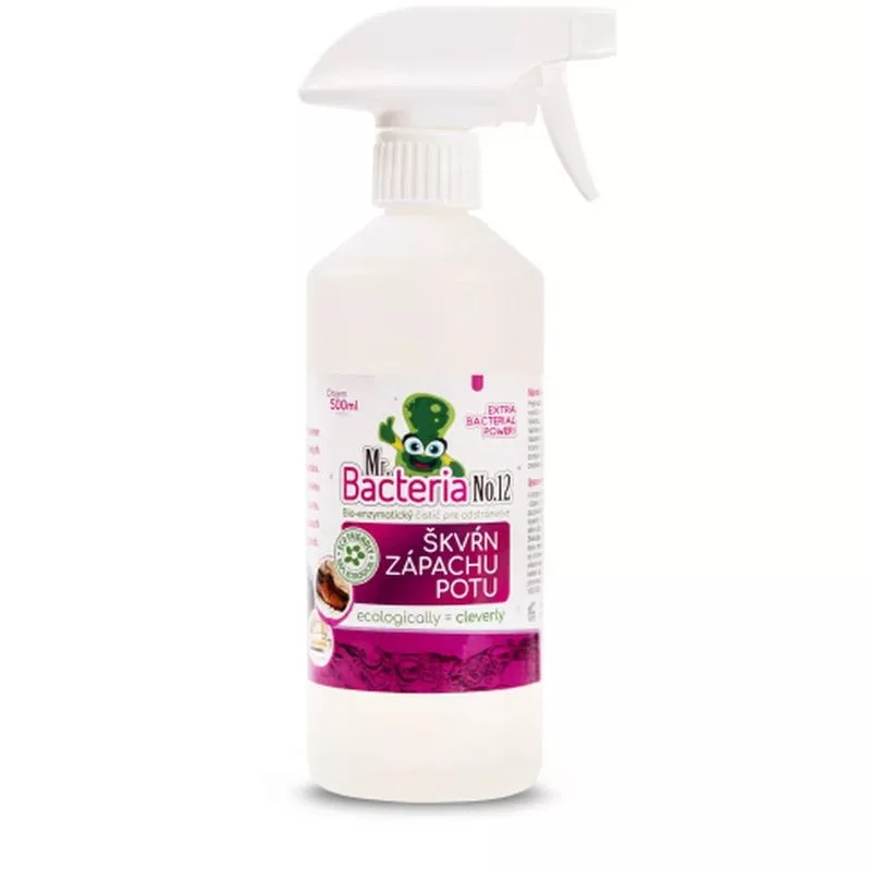 A Mr. Bacteria No. 12 speciálisan kiválasztott természetes baktériumok keveréke, amelyek enzimeket termelnek, és képesek gyorsan és hatékonyan lebontani és megemészteni a szagforrásként szolgáló szerves hulladékot. Ideális termék vizelet, széklet, hányás vagy ételmaradványok eltávolítására minden textilfelületről, ahol egy lépésben tisztít, frissít és szagtalanít azáltal, hogy lebontja és megemészti a szennyeződés forrását. Kiválóan alkalmas sportruházat és kiegészítők szagtalanítására is.