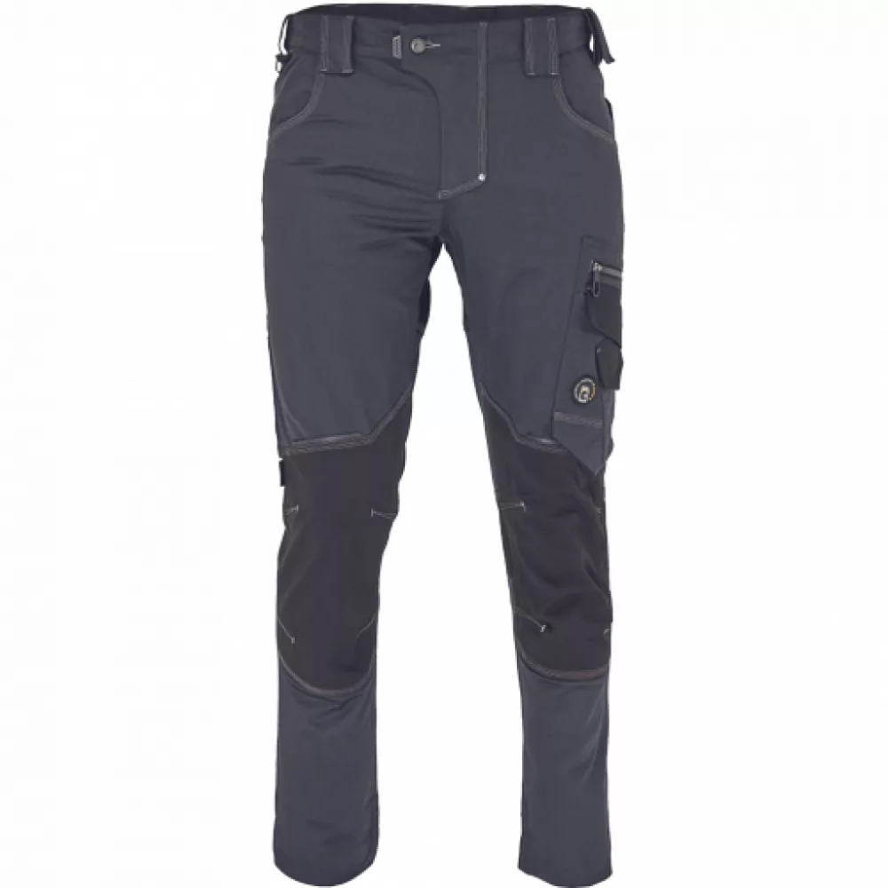 férfi munkanadrág innovatív, rugalmas TRIFIBETEX anyagból CORDURA betétekkel, elöl 2 ékzseb, hátul 2 tépőzáras foltzseb, bal oldalt nagy multifunkciós zseb, jobb oldalt multifunkciós vonalzó, kés és ceruzatartó, fém "D" gyűrű, rugalmas derék, hosszabbítható szárhossz, fényvisszavető elemek, dekoratív tripla varrás kontrasztos színnel, kalapácstartó