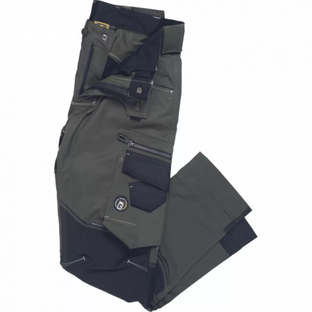 férfi munkanadrág innovatív, rugalmas TRIFIBETEX anyagból CORDURA betétekkel, elöl 2 ékzseb, hátul 2 tépőzáras foltzseb, bal oldalt nagy multifunkciós zseb, jobb oldalt multifunkciós vonalzó, kés és ceruzatartó, fém "D" gyűrű, rugalmas derék, hosszabbítható szárhossz, fényvisszavető elemek, dekoratív tripla varrás kontrasztos színnel, kalapácstartó