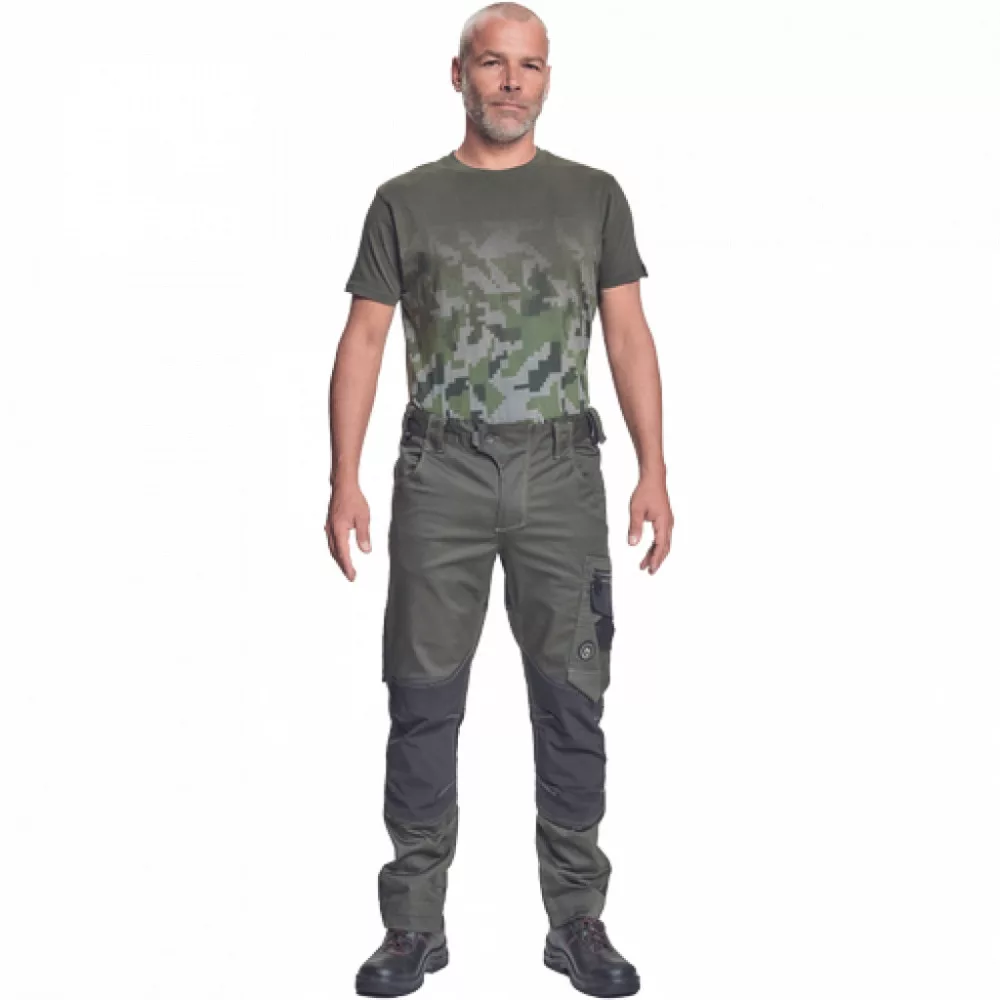 férfi munkanadrág innovatív, rugalmas TRIFIBETEX anyagból CORDURA betétekkel, elöl 2 ékzseb, hátul 2 tépőzáras foltzseb, bal oldalt nagy multifunkciós zseb, jobb oldalt multifunkciós vonalzó, kés és ceruzatartó, fém "D" gyűrű, rugalmas derék, hosszabbítható szárhossz, fényvisszavető elemek, dekoratív tripla varrás kontrasztos színnel, kalapácstartó