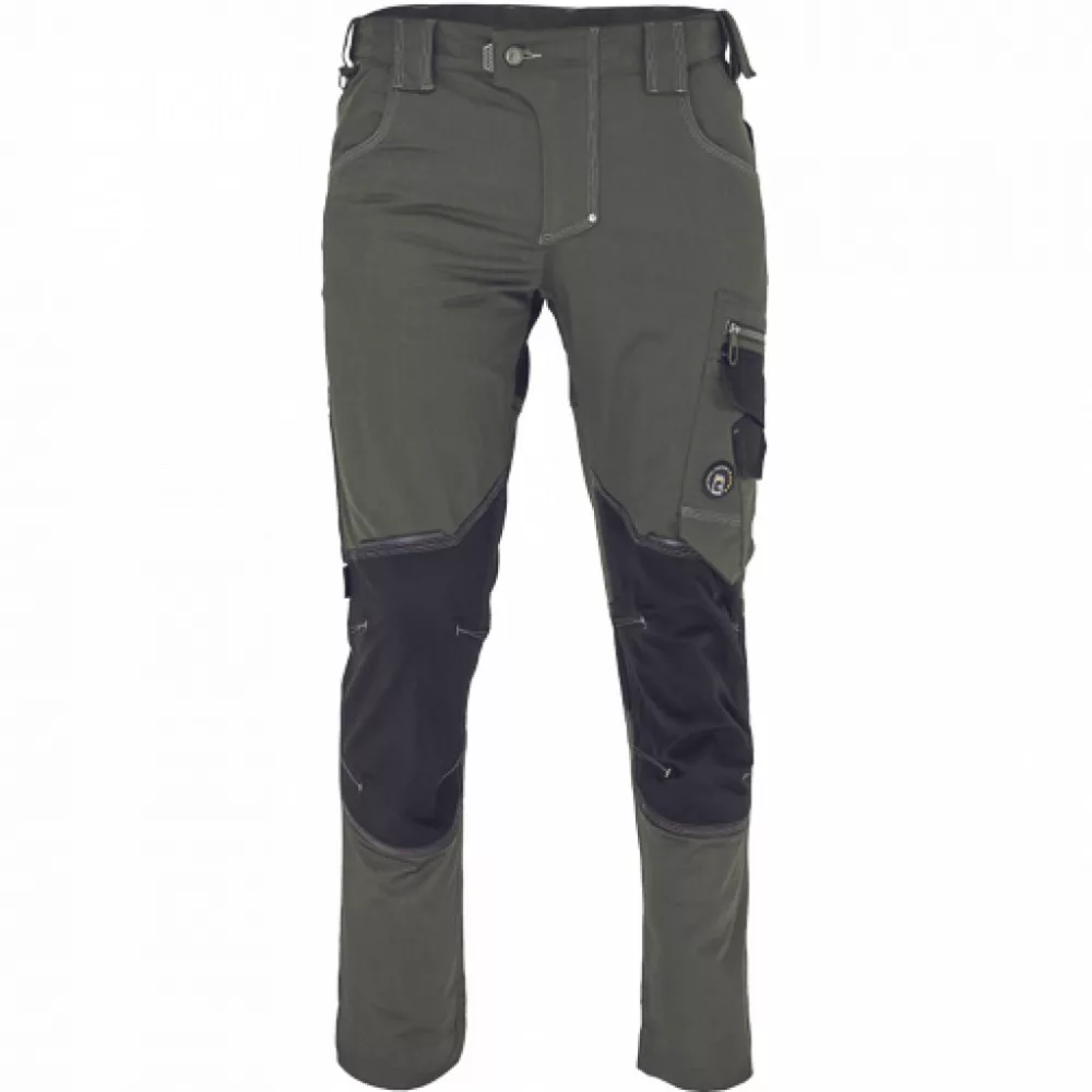 férfi munkanadrág innovatív, rugalmas TRIFIBETEX anyagból CORDURA betétekkel, elöl 2 ékzseb, hátul 2 tépőzáras foltzseb, bal oldalt nagy multifunkciós zseb, jobb oldalt multifunkciós vonalzó, kés és ceruzatartó, fém "D" gyűrű, rugalmas derék, hosszabbítható szárhossz, fényvisszavető elemek, dekoratív tripla varrás kontrasztos színnel, kalapácstartó