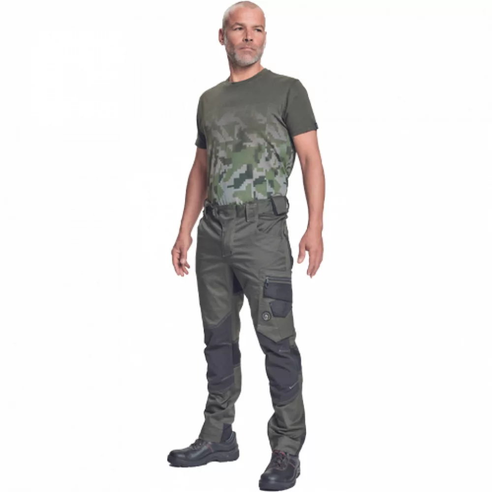 férfi munkanadrág innovatív, rugalmas TRIFIBETEX anyagból CORDURA betétekkel, elöl 2 ékzseb, hátul 2 tépőzáras foltzseb, bal oldalt nagy multifunkciós zseb, jobb oldalt multifunkciós vonalzó, kés és ceruzatartó, fém "D" gyűrű, rugalmas derék, hosszabbítható szárhossz, fényvisszavető elemek, dekoratív tripla varrás kontrasztos színnel, kalapácstartó