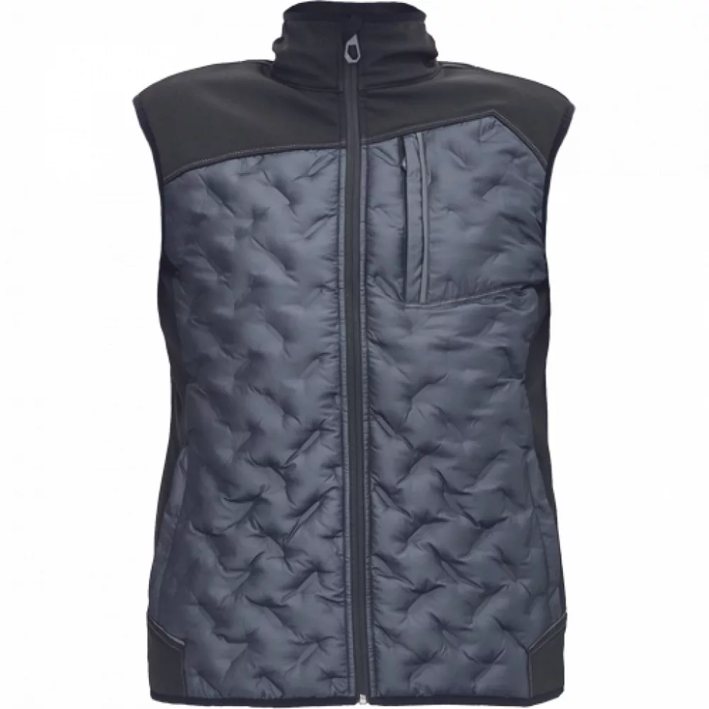 Cipzáras mellény állógallérral, 2 mély, cipzáras oldalzsebbel, gumírozott derékrésszel és színben harmonizáló fényvisszavető elemekkel.
