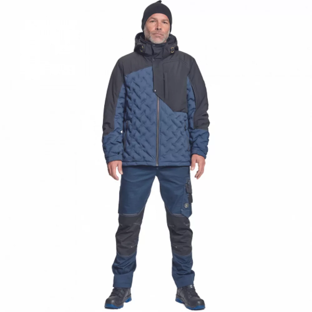 férfi munkanadrág innovatív, rugalmas TRIFIBETEX PRO anyagból, elöl 2 ékzseb, hátul 2 tépőzáras foltzseb, bal oldalt nagy multifunkciós zseb, jobb oldalt multifunkciós vonalzó, kés és ceruzatartó, fém "D" gyűrű, rugalmas derék, hosszabbítható szárhossz, fényvisszavető elemek, dekoratív tripla varrás kontrasztos színnel, kalapácstartó