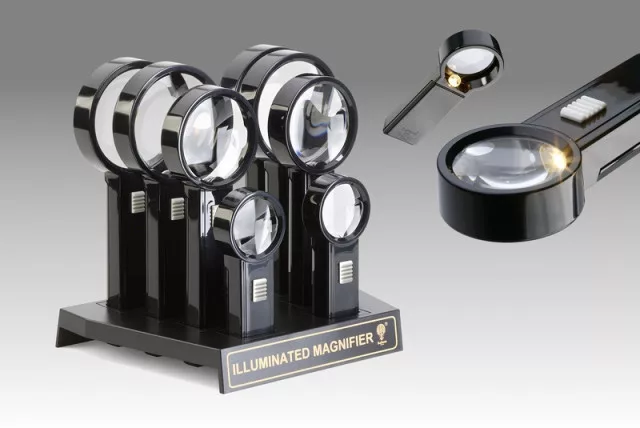 Olvasónagyító készlet 8db világítással + állvány műanyag lencsékre.