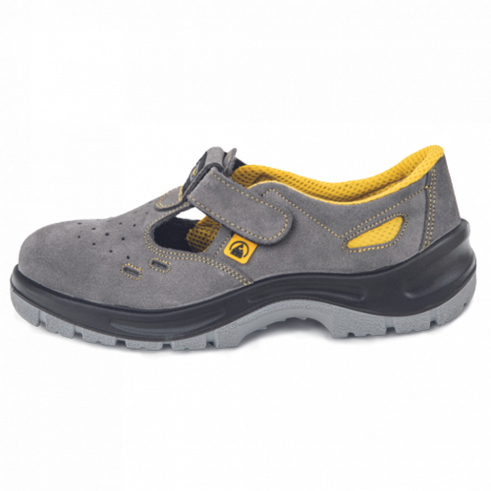 Fémmentes ESD biztonsági szandál velúrbőr felsőrésszel, légáteresztő, antimikrobiális és antibakteriális kezelésű, kopásálló belső béléssel. Kompozit lábujjvédővel, csúszásgátló, dupla sűrűségű PU talppal és kompozit átszúrás ellen védő talpbetéttel készül.