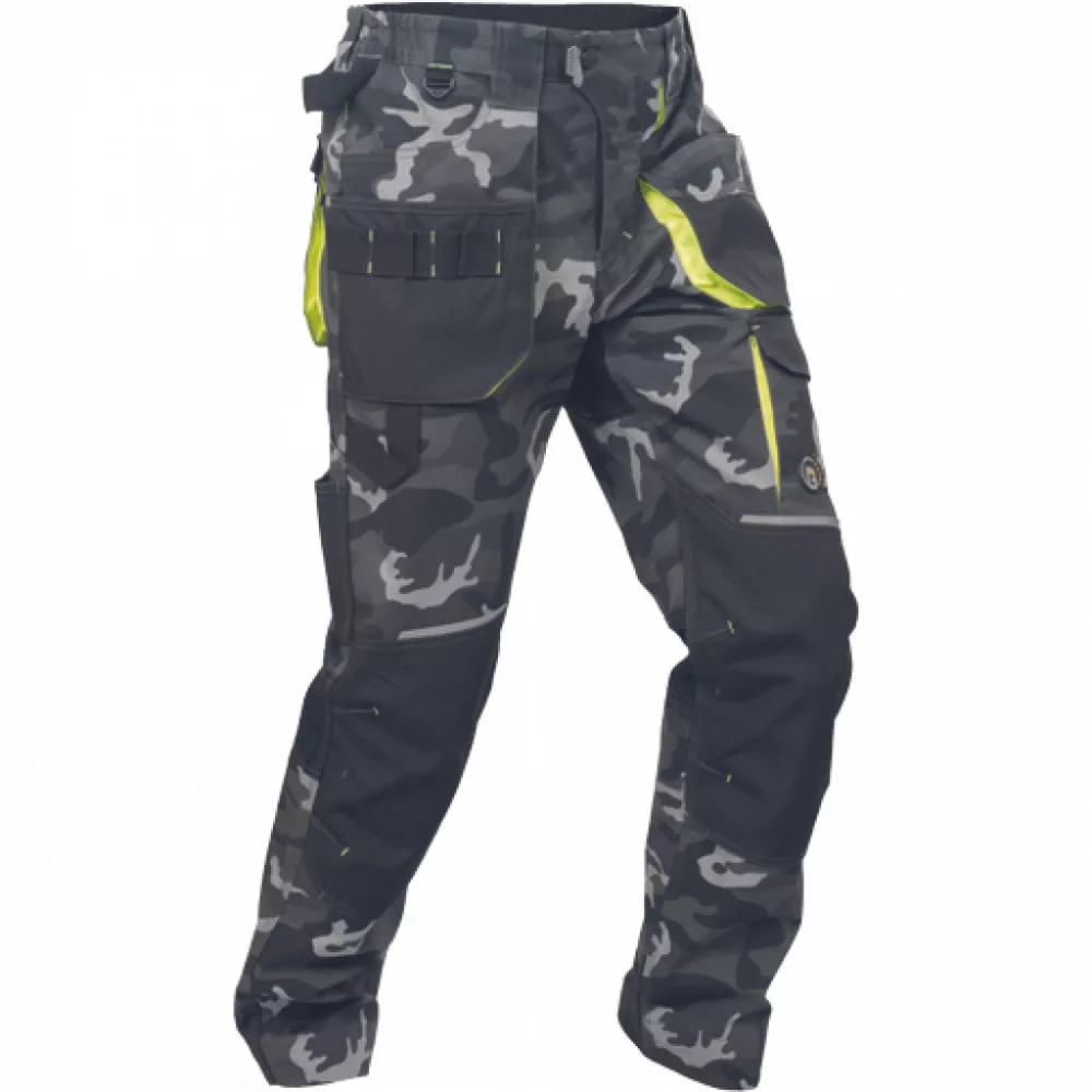 Férfi nadrág rugalmas derékkal és többfunkciós zsebekkel. Megerősített térdrész és térdzseb Oxford 600D anyagból térdvédő behelyezéséhez. Ellenálló hármas fedőző varrás az üleprészen és a meghosszabítható szárakon. Modern terepmintával.