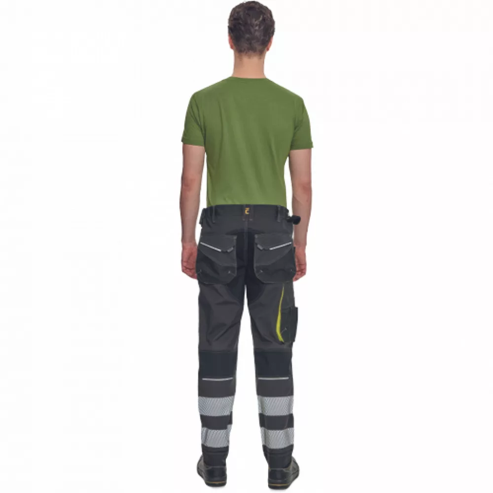 Férfi nadrág rugalmas derékkal és többfunkciós zsebekkel, 7 cm-es szegmentált fényvisszavető csíkokkal. Megerősített térdrész és térdzseb Oxford 600D anyagból térdvédő behelyezéséhez. Ellenálló hármas fedőző varrás az üleprészen és a meghosszabítható szárakon.