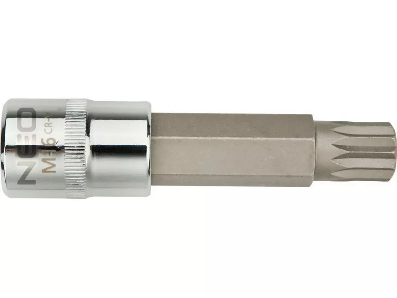 NEO Spline bit 1/2”-os fészkű dugófeltéten, 55 mm hosszú. A dugófeltét nagy ellenállóképességű króm-vanádium acélból készül. A hatlapú bit kiváló minőségű S2 acélötvözetből készül. A NEO márka a professzionális igényeket is kielégíti.