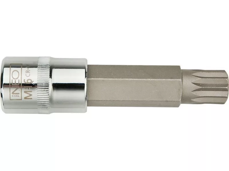 NEO Spline bit 1/2”-os fészkű dugófeltéten, 100 mm hosszú. A dugófeltét nagy ellenállóképességű króm-vanádium acélból készül. A hatlapú bit kiváló minőségű S2 acélötvözetből készül. A NEO márka a professzionális igényeket is kielégíti.