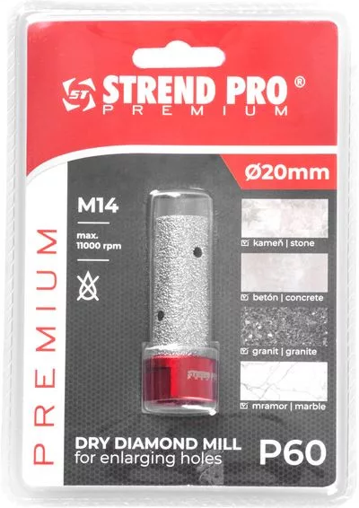 A Strend Pro gyémántvágó kemény burkolatban, kerámiában, üvegben és márványban meglévő furatok nagyítására, tisztítására és lekerekítésére szolgál. Nem alkalmas új nyílások fúrására. A megtisztított nyílások csökkentik a csempe, üveg vagy márvány későbbi megrepedésének veszélyét. A marást felfelé és lefelé javasoljuk úgy, hogy a maró teljes magasságát használjuk, így biztosítva annak hűtését. Száraz maráshoz használják sarokcsiszolóban (M14-es menet).