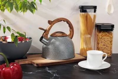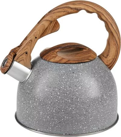 Ez az elegáns 2500 ml-es teáskanna szürke színben ideális a mindennapi használatra. Sípoló funkciójával és modern, faimitációval ellátott fogantyúval és fedéllel nemcsak praktikus, hanem dekoratív elemévé is válik konyhájának.