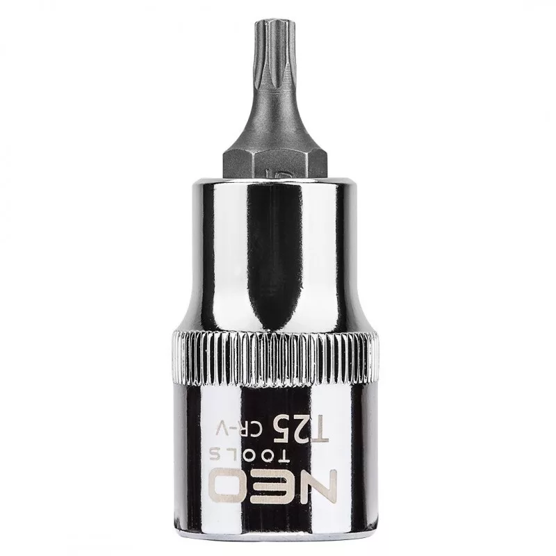 NEO Torx bit ½”-os fészkű dugófeltéten, 55 mm hosszú. A dugófeltét nagy ellenállóképességű króm-vanádium acélból készül. A hatlapú bit kiváló minőségű S2 acélötvözetből készül. A szerszám minőségét bizonyítja a TÜV tanúsítvány.