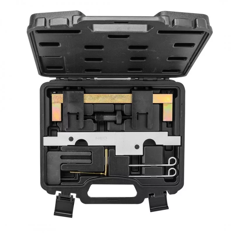 Vezérműtárcsa-blokkoló készlet BMW autókhoz. A készlet benzinüzemű motorok vezérműtárcsájának blokkolására szolgáló elemeket tartalmaz. Biztosítja a motor beállításához és blokkolásához szükséges alapszerszámokat.