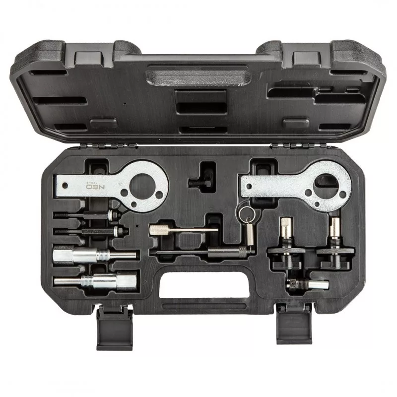 Vezérműtárcsa-blokkoló készlet Fiat és GM márkájú autókhoz. A készlet dízelüzemű motorok vezérműtárcsájának blokkolására szolgáló elemeket tartalmaz. Biztosítja a motor beállításához és blokkolásához szükséges alapszerszámokat.