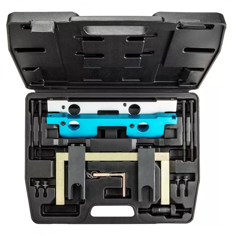 Vezérműtárcsa-blokkoló készlet BMW autókhoz. A készlet benzinüzemű motorok vezérműtárcsájának blokkolására szolgáló elemeket tartalmaz. Biztosítja a motor beállításához és blokkolásához szükséges alapszerszámokat.