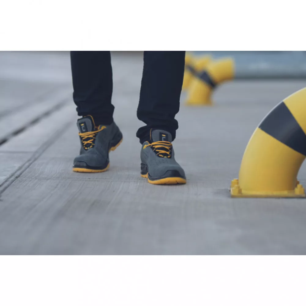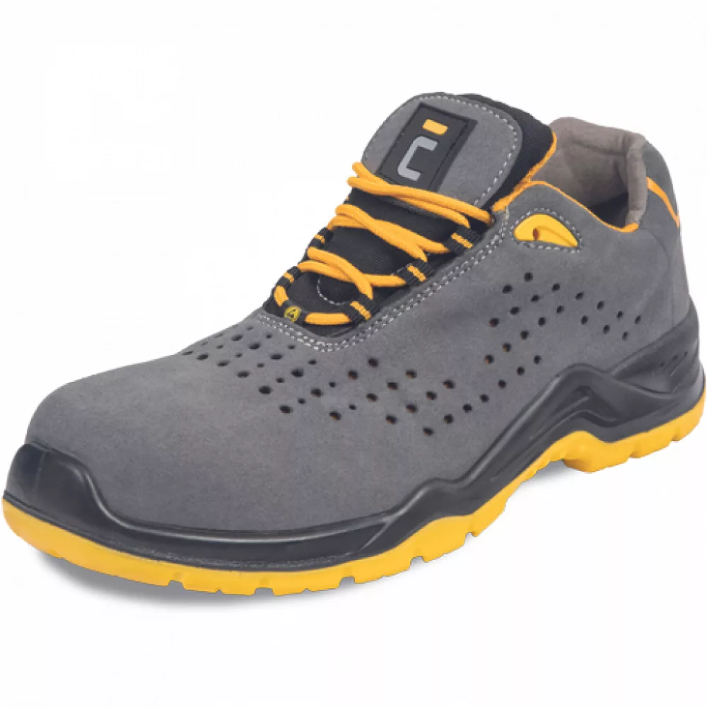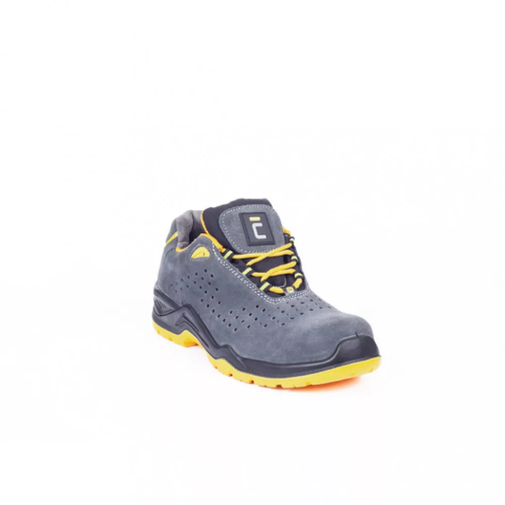 Biztonsági félcipő szürke-sárga színkombinációban. A cipő felső része nubuk bőrből készült, teljes hosszában perforált. Az olajálló csúszásgátló talp kettős sűrűségű poliuretánból készül. A lábbelik kényelmes, perforált belső talpbetéttel, energiaelnyelő sarokkal, kompozit orrmerevítővel, és kompozit köztappal vannak felszerelve. A lábbelik nem tartalmaznak fém alkatrészeket, ESD lábbeli.