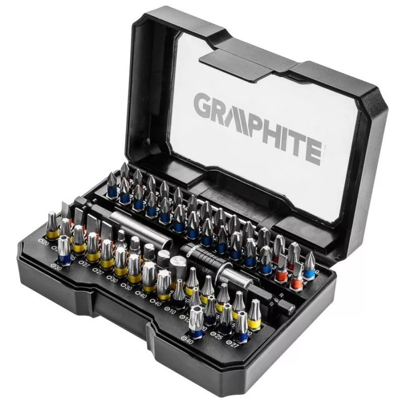 GRAPHITE Nagy, univerzális csavarbehajtó bit készlet (Ref.sz. 56H600), a csavarbehajtáshoz szükséges különböző típusú biteket tartalmazza. A leggyakrabban használt méretek (PH2, PZ2 ..) többször megismételve.
