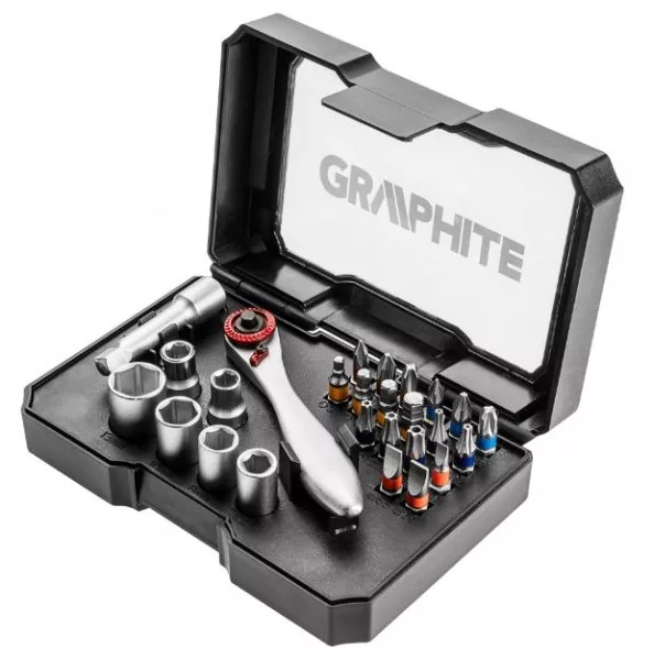 GRAHPITE bit és dugókulcs alapkészlet (nr. ref 56H604), ideális a kisebb szerelési munkákhoz. A racsnis hajtóval szolidan és gyorsan összeszerelheti az elemeket