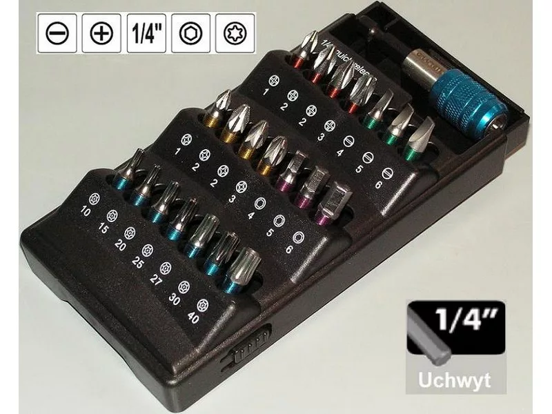 A GRAPHITE csavarhúzó-bit készletben a legnépszerűbb ?" x 25 mm-es bitek kaptak helyet. A tárolódoboz megfelelő kialakítása lehetővé teszi rögzítését szerelőöveken bittartóként. Az egykezes bit kitoló és visszahúzó rendszer jelentősen megkönnyíti a bitekhez való hozzáférést és cseréjüket. Az egyes bitek színes gyűrűi igen megkönnyítik az éppen szükséges bit azonosítását.