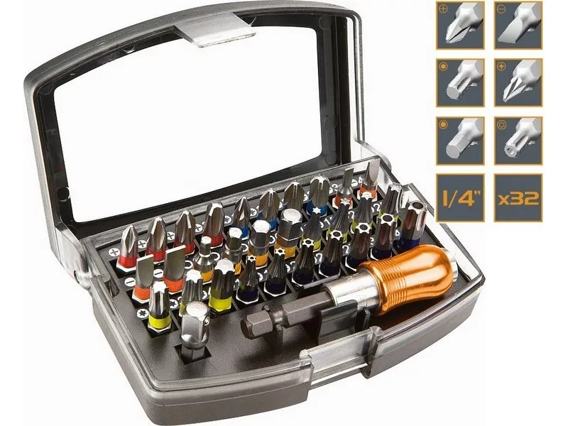 NEO ?"-os, 32 elemes csavarhúzó bit készlet. Az alkalmazott S2 acélötvözetnek köszönhetően a hegyek keménysége eléri a 60 HRC értéket, ami jelentősen megnöveli élettartamukat és a velük végzett munka minőségét. A készlet 25 mm hosszú lapos, kereszt, imbusz, Torx, furatos Torx bitek bő választékát tartalmazza. A bitek mágneses heggyel rendelkeznek. A készletet bit befogó és dugóadapter egészíti ki. A termék kiváló minőségét és megbízhatóságát bizonyítja a TÜV Rheinland tanúsítvány. A NEO márka a professzionális igényeket is kielégíti.