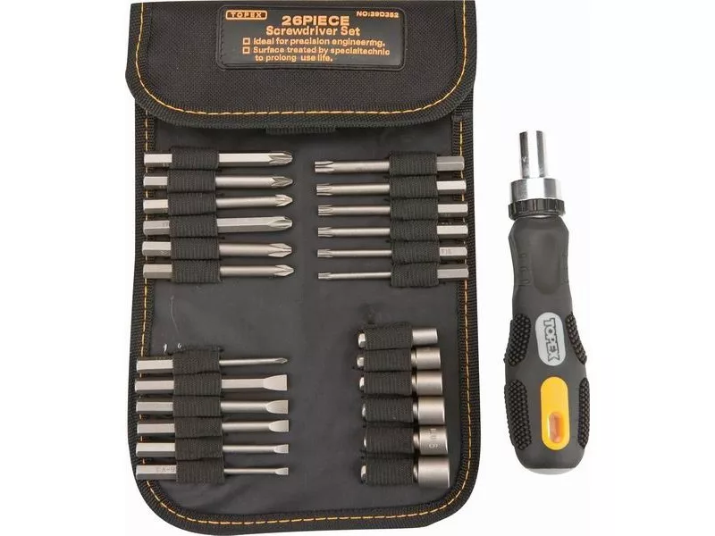 A TOPEX dugókulcs és csavarhúzó bit készlet 26 elrendezett elemet tartalmaz szövetből készült tokban. Mindegyik elem kiváló minőségű, a szerszámnak hosszú élettartamot biztosító króm-vanádium acélból készült. A készletben többek között csavarhúzó dugóbitek, csavarhúzó bitek, valamint a munkavégzés kényelmét biztosító, csúszásmentes bevonattal ellátott műanyag markolatú csavarhúzó nyél található. A készlet széleskörű felhasználásra találhat mindenféle apróbb szerelési, gép- és autójavítási és egyéb munkában minden ezermester otthonában vagy garázsában. A TOPEX márka ezermestereknek készül.