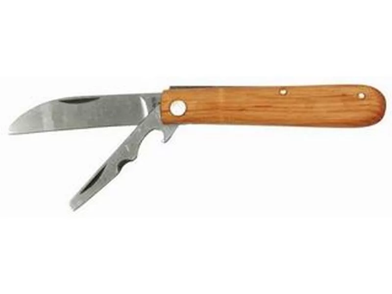 Szerelőkés, 180 mm hosszú. Fabetétes markolat. A pengét a véletlen kinyitás ellen reteszelés védi. Két pengével felszerelt bicska - univerzális penge, valamint egy csavarhúzóként használható.