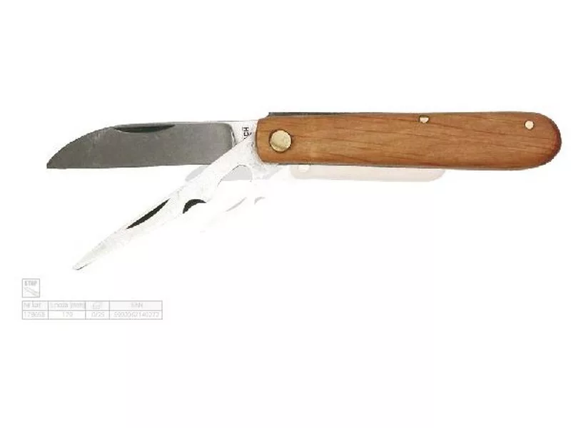Szerelőkés, 170 mm hosszú. Fabetétes markolat. A pengét a véletlen kinyitás ellen reteszelés védi. Kétpengéjű - univerzális penge, valamint ár.