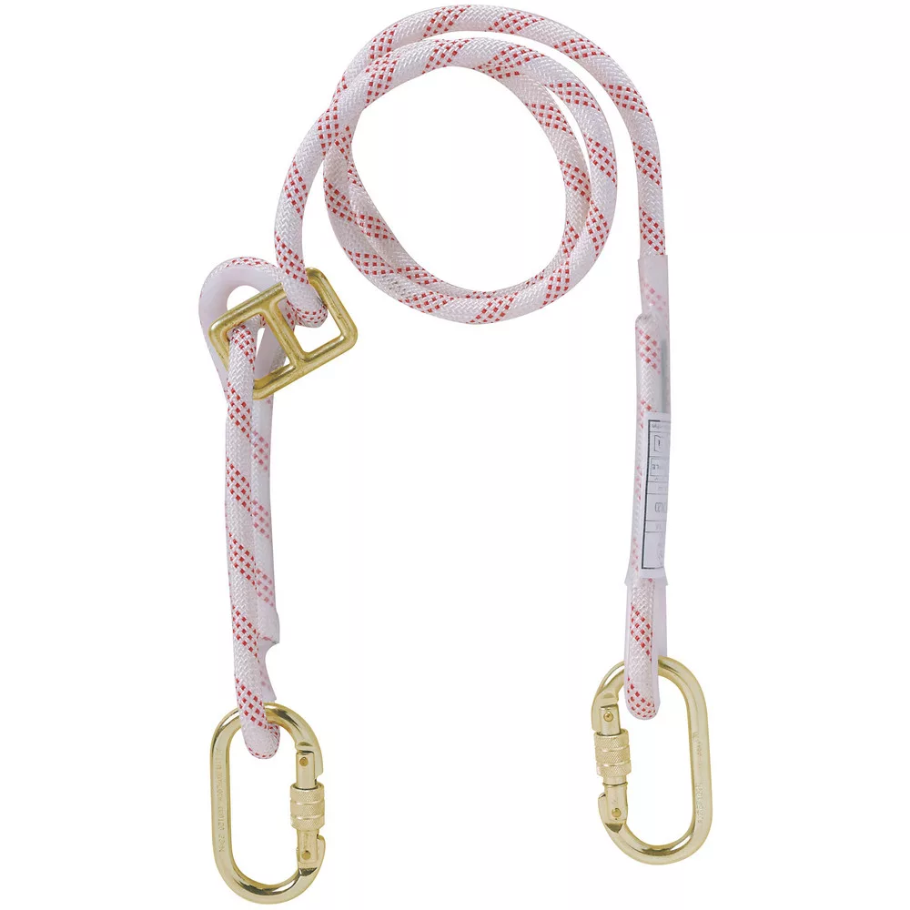 • 2 m-es, fémcsattal állítható hosszúságú poliamid hurkolt végein 18 és 50 mm nyílású karabiner, kettős rugós acélzárral.