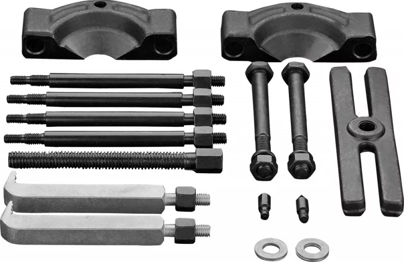 NEO kétkörmös csapágylehúzó kengyel és elválasztó, a szett a közös tengelyekre szerelt elemek, pl. csapágyak, lendkerekek, görgők elválasztására szolgáló készlet Kiváló minőségű, a szerszámnak hosszú élettartamot biztosító acélból készül. A termék kiváló minőségét és megbízhatóságát bizonyítja a TÜV Rheinland tanúsítvány. A NEO márka a professzionális igényeket is kielégíti.