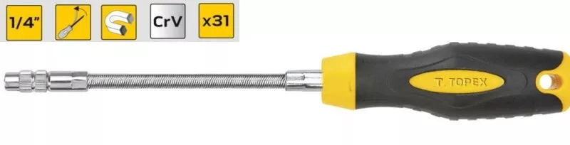 TOPEX csavarhúzó flexibilis szárral, 190 mm hosszú, bitekkel és négyzetes ?"-os közdarabban együtt. Kiváló minőségű, a szerszámnak hosszú élettartamot biztosító króm-vanádium acélból készül. A mágneses hegy megkönnyíti a szerszámmal végzett munkát A flexibilis szár lehetővé teszi használatát még a nehezen hozzáférhető helyeken is. Az ergonómikus, csúszásmentes anyaggal bevont műanyag markolat biztosítja a kényelmet és a biztonságot a munkavégzés során. A TOPEX márka ezermestereknek készül.