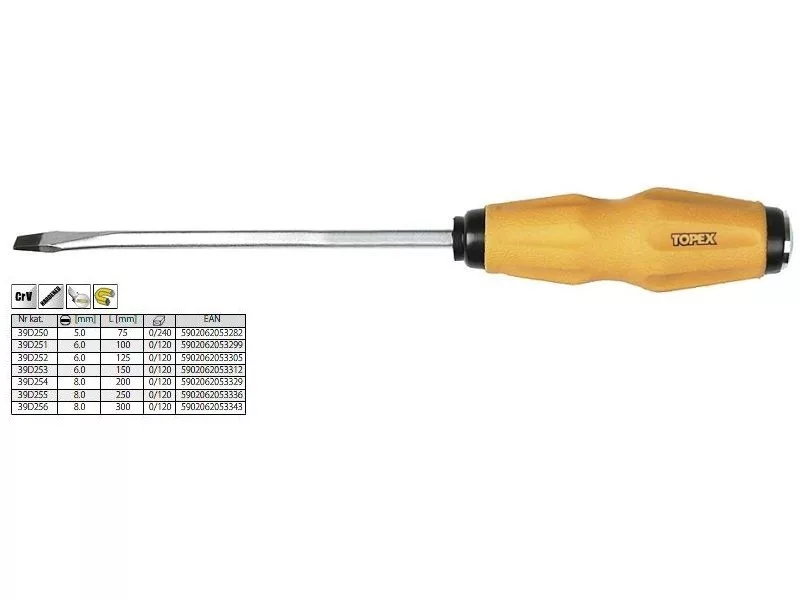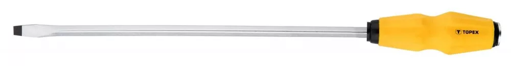 A TOPEX üthető lapos csavarhúzó besült, túl erősen meghúzott csavarok kilazítására, meghúzására szolgál. Hegye nagy ellenállóképességű, a szerszámnak hosszú élettartamot biztosító króm-vanádium acélból készült. A mágneses hegy megkönnyíti a szerszámmal végzett munkát A műanyagból készült ergonómikus markolat jól fekszik a tenyérben, növelve a munkavégzés kényelmét. A TOPEX márka ezermestereknek készül.