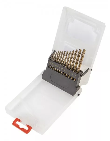 VERTO fémfúró készlet (kat. sz. 60H810) 1,5-6.5 mm mérettartományban. Magas minőségű gyorsvágó acélból. Különleges élezésének köszönhetően ideálisan beválnak pontos furatok készítésében mindenféle fémben.