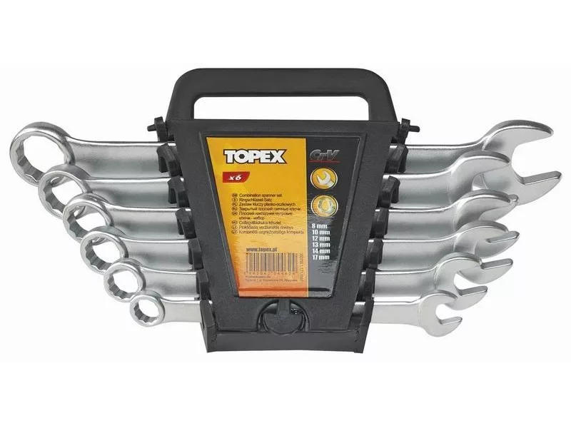 A TOPEX csillag-villáskulcs készlet kiválóan beválik szerelési, barkácsolási munkákban. A csillagkulcs a csavarok precízebb fogását teszi lehetővé. A kulcsok nagy ellenállóképességű, a szerszámnak hosszú élettartamot biztosító króm-vanádium acélból készültek. Praktikus, a tárolást megkönnyítő műanyag csomagolásban vannak elrendezve. A TOPEX márka ezermestereknek készül.