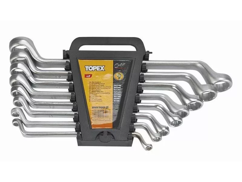A TOPEX hajlított csillagkulcs készlet kiválóan beválik szerelési, barkácsolási munkákban. A kulcsok mindkét végén a hatlapú csavarok be- és kicsavarására szolgáló csillagkulcs van. Kialakításának köszönhetően lehetővé teszi a mélyedésekben elhelyezett csavarokkal is a munkát. Nagy ellenállóképességű króm-vanádium acélból készültek. Praktikus, a tárolást megkönnyítő műanyag csomagolásban vannak elrendezve. A TOPEX márka ezermestereknek készül.