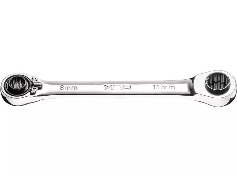 Racsnis csillagkulcs – négy különböző méret egy szerszámban. A kulcs nagy tartósságot biztosító CrV acélból készül. A 72-fogas kilincsmű lehetővé teszi használatát nehezen hozzáférhető helyeken is. Különféle, így négylapú, hatlapú, Torx, tizenkétlapú és spline fejű csavarok csavarozására is alkalmas. Tökéletesen beválik olyan alkalmazásokban, ahol a szerszám tömege és univerzális jellege számít. A kulcs kiváló minőségét bizonyítja a 25 éves jótállás. A NEO márka a professzionális igényeket is kielégíti.
