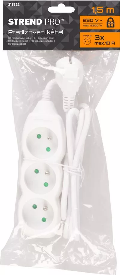 A praktikus DG-F803B hosszabbító kábel fehér színben biztosítja az 1,5 méteres villamosenergia-ellátást. Használható irodákban és háztartásokban is. Három konnektor csatlakozónak köszönhetően lehetővé teszi több eszköz csatlakoztatását egyszerre.