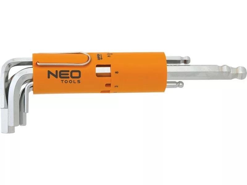 NEO imbuszkulcs készlet króm-vanádium acélból. A készlet 8 db kulcsot tartalmaz 2 mm – 10 mm közötti méretekben, praktikus csomagolásban. A gömbfej a max. 30??os munkaszöggel még funkcionálisabbá teszi a szerszámot. Az ISO 2936 tanúsítvány. A NEO márka a professzionális igényeket is kielégíti.