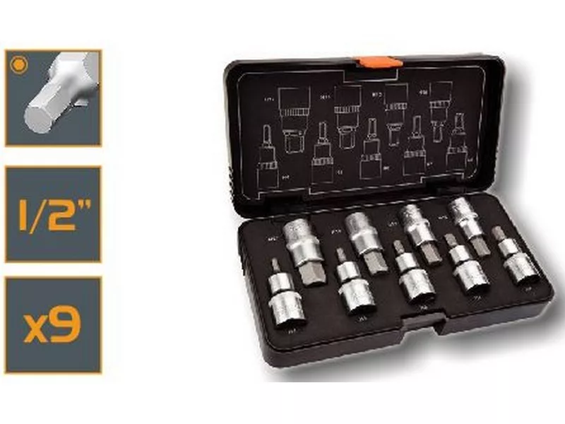 Imbusz dugó bit 9 db-os klt. 55 mm, ½, dugókulcs CrV acél, bit S2 acél, méretek: H4, H5, H6, H7, H8, H10, H12, H14, H17