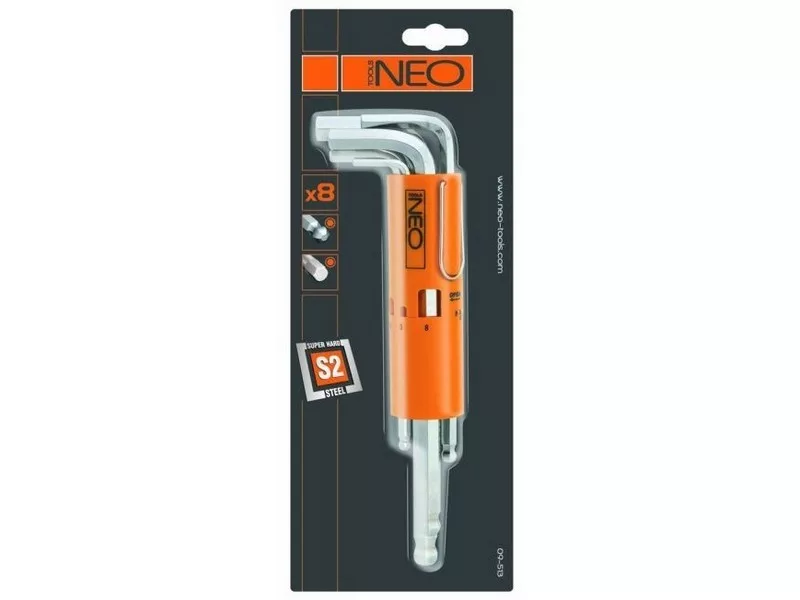 A NEO imbuszkulcs készlet a DIN 2936 szabványnak megfelelő kivitelű. A készlet 8 db imbuszkulcsot tartalmaz 2 mm – 10 mm közötti méretekben, praktikus csomagolásban. A gömbfej a max. 30º‑os munkaszöggel még funkcionálisabbá teszi a szerszámot. A kiváló minőségű S2 acélötvözet sokéves tartósságot biztosít a kulcsoknak. A szerszám minőségét bizonyítja a TÜV tanúsítvány és a gyártó által nyújtott 25 éves jótállás. A NEO márka a professzionális igényeket is kielégíti.
