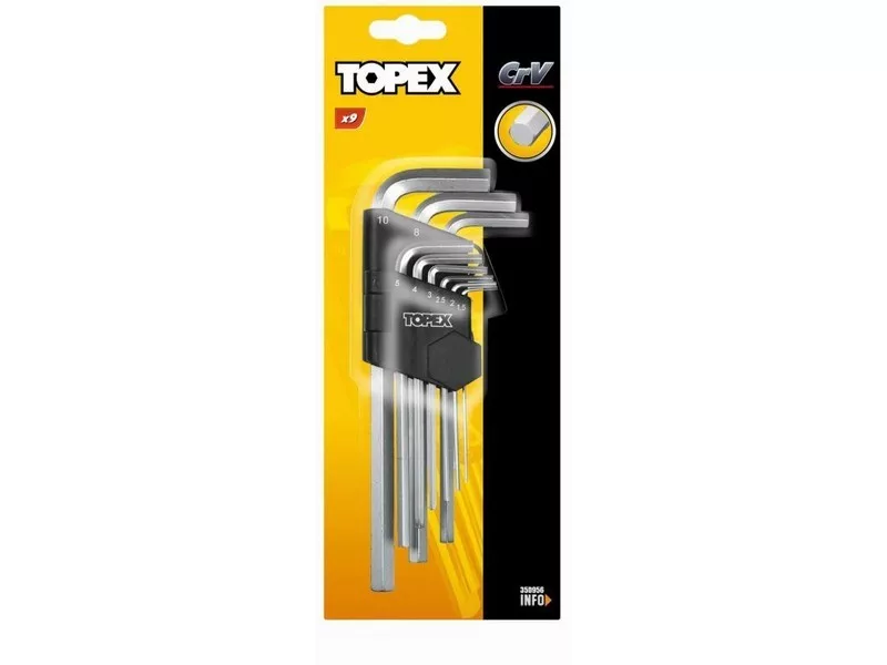 TOPEX hosszú imbuszkulcs készlet, 1,5-10 mm méretben. Nagy ellenállóképességű, a terméknek hosszú élettartamot biztosító króm-vanádium acélból készülnek. A praktikus, mindegyik kulcsnak külön megjelölt rekesszel rendelkező műanyag tok megkönnyíti a tárolásukat. A TOPEX márka ezermestereknek készül.