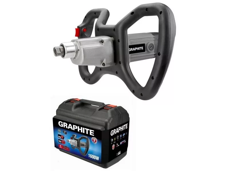 GRAPHITE professzionális, kétsebességes elektromos keverőgép (kat. sz. 58G784) 1 600 W teljesítményű motorral sűrű és híg gipsz-, ragasztómasszák, festékek keverésére – egyszerre max. 90 l mennyiségben. A keverőgép strapabíró konstrukciójának és effektív hőelvezetési rendszerének köszönhetően alkalmas a folyamatos üzemű működésre nagy építkezések kivitelezési munkálatai során. A keverőgép orsóinak fordulatszáma szabályozható, és a lágyindítási funkció is be van építve. A gép motorja I. sebességi fokozatban 100-420 perc⁻¹, II. sebességi fokozatban pedig 150-600 perc⁻¹ fordulatszámon képes üzemelni. A gép megfelelő formakialakítású, csúszásmentes anyaggal bevont markolata kényelmes, biztonságos munkavégzést tesz lehetővé hosszabb időn keresztül is. A biztonság növelésére a keverőgép fel lett szerelve a véletlen beindítást megakadályozó reteszeléssel is. A keverőgéphez tartalék keverőszárak, szerelőkulcsok és hordtáska is tartozik. A CE tanúsítvány bizonyítja az európai szabványoknak való megfelelést.